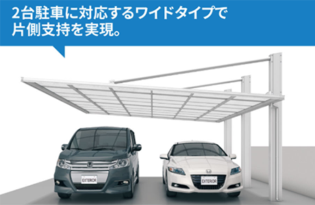 両側支持で車のドアの開閉がしやすく、荷物の出し入れも快適。広々とした2台分のスペースで、駐車時のストレスもありません。