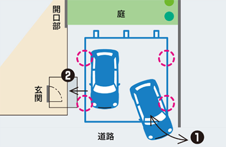 ①両側に柱がないため、2台とも車からの見通しが良く、車の出し入れや乗り降りがしやすくなります。