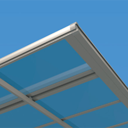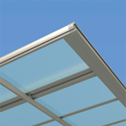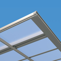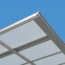 - 熱線遮断ポリカーボネート板(かすみ調)は、天候や見る角度により、青みがかった色合いに見えるパネルです。