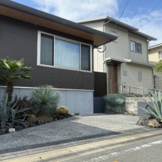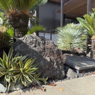 ファサードを彩るのは、悠久の時を思わせる溶岩石と、堂々たる姿を誇るソテツの植栽。力強さと優美さを兼ね備えた自然の造形美が、住まいの格をより一層引き立てています。