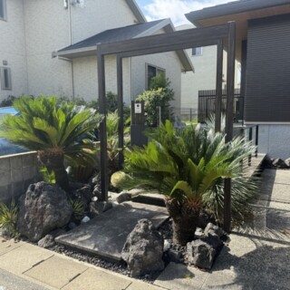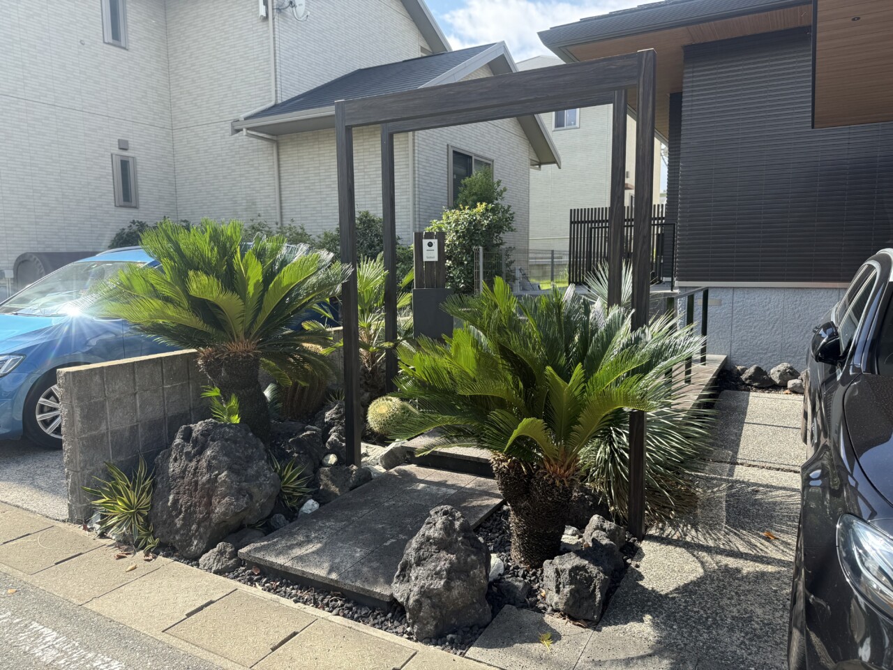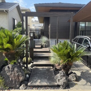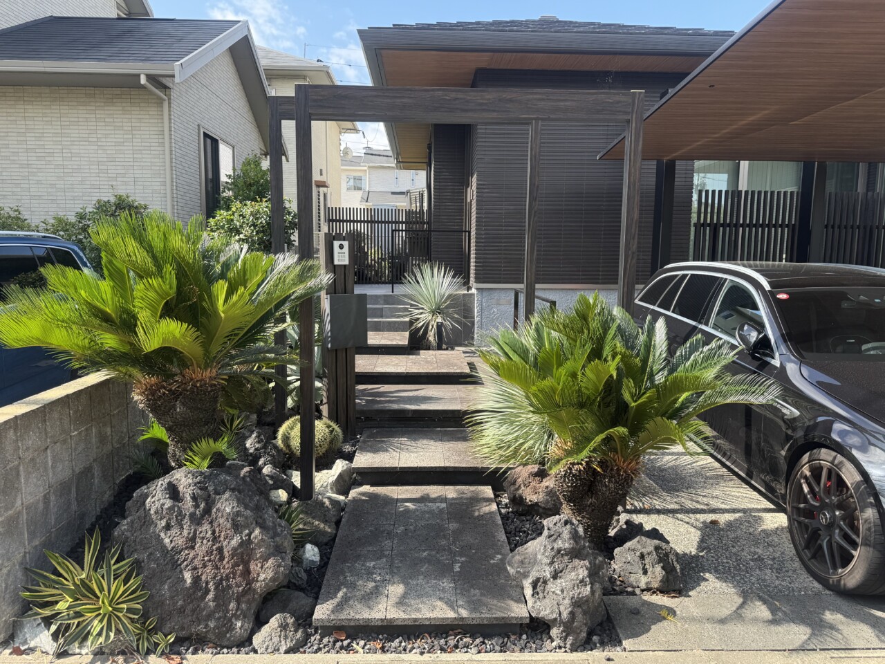 日常に寄り添いながらも、非日常の気配を感じさせる特別な外構。古代の力強さと現代の洗練が響き合う、唯一無二のエクステリア空間がここに完成しました。