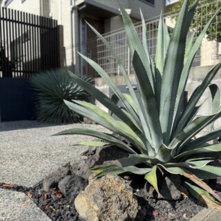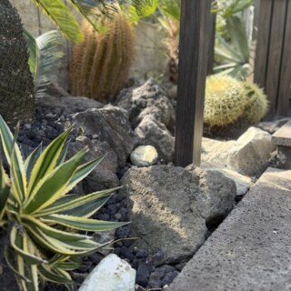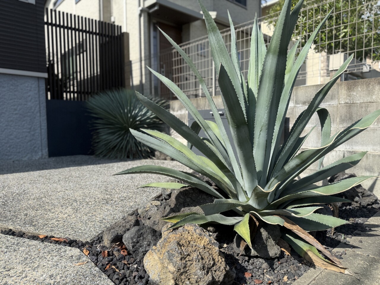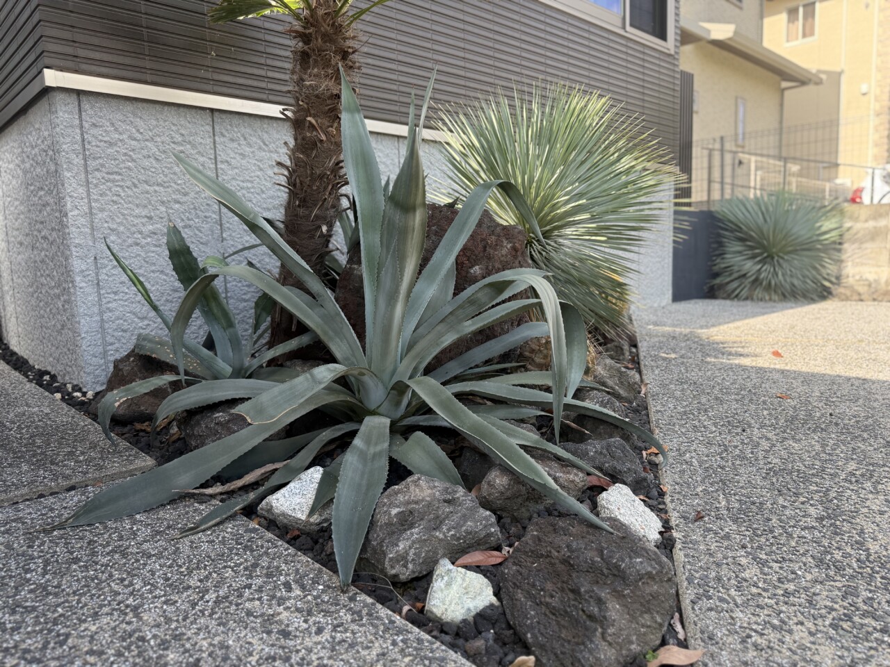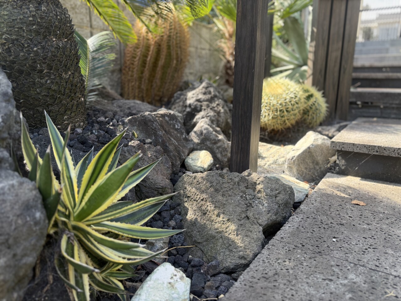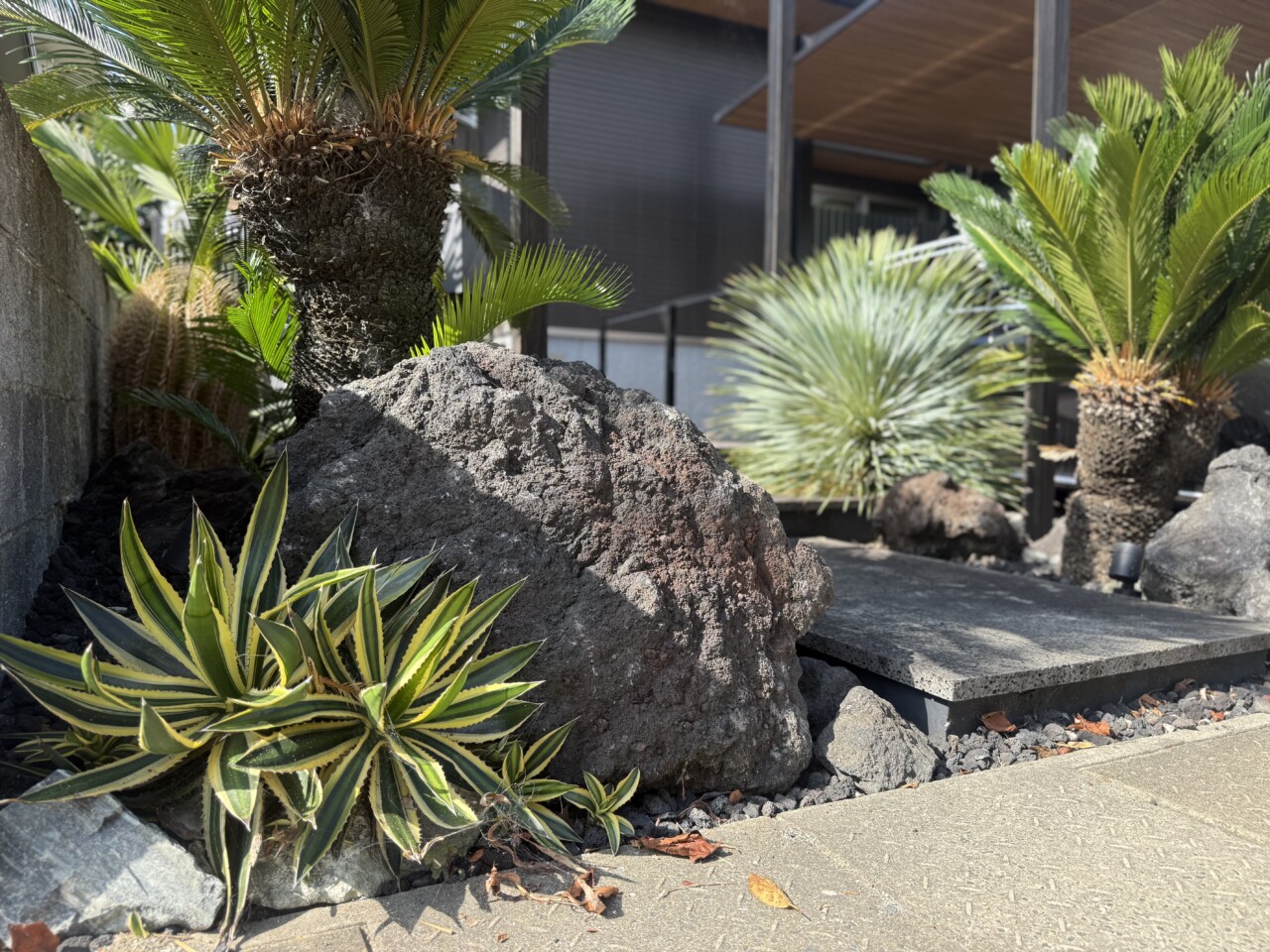 さらに、アガベやユッカ・ロストラータといった希少性の高い植栽を随所に配置。南国的な趣を纏いながらも重厚感を失わない植栽計画により、唯一無二の景観が生み出されました。夜には照明が石や植物を照らし出し、昼間とは異なる幻想的な陰影の美を演出します。