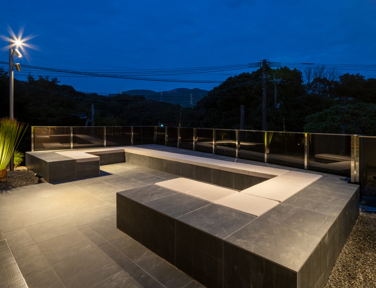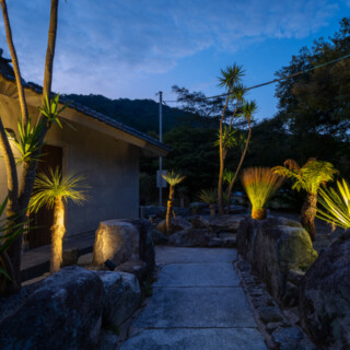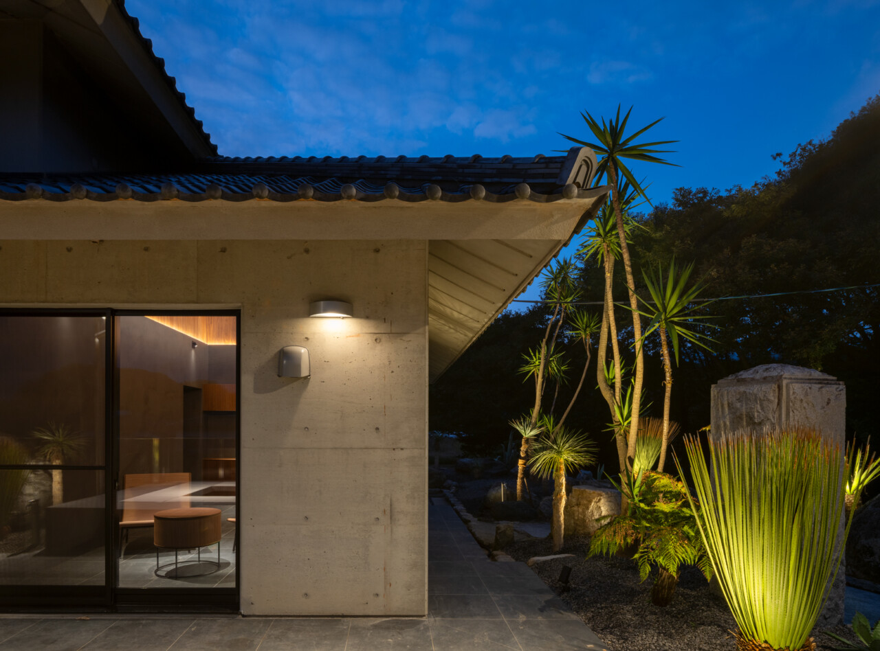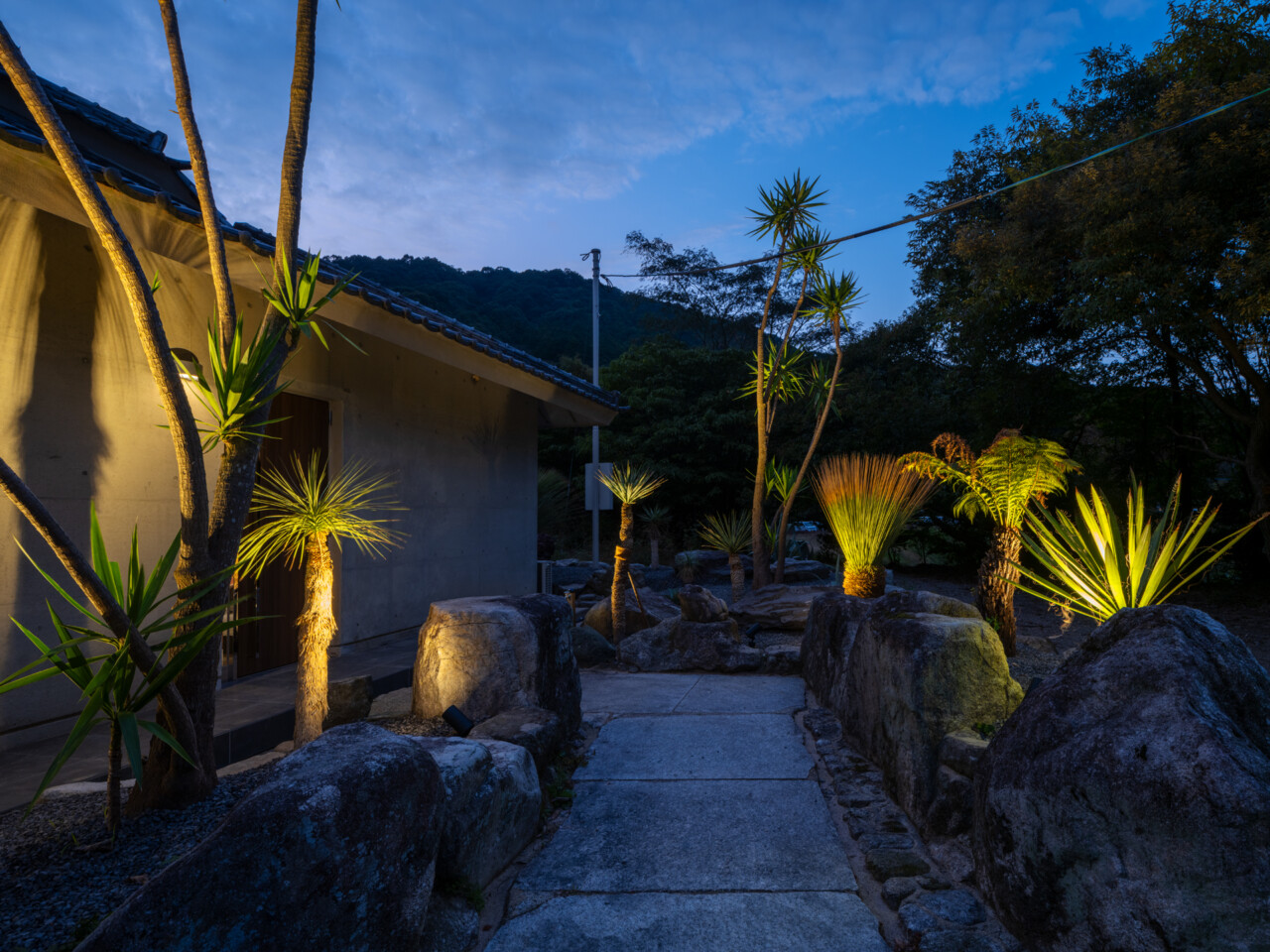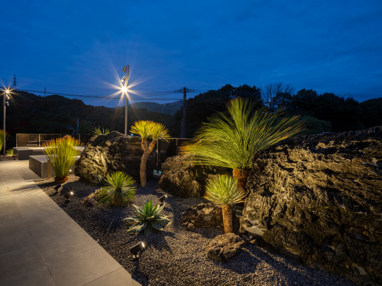 夜になると、計算されたライティングが石や植物をやさしく照らし出し、昼間とは異なる表情を演出。光と影が織りなす陰影が、静寂に包まれた幻想的な時間を生み出します。